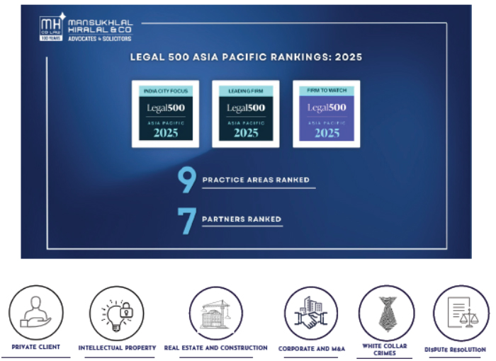 In the 2025 edition of The Legal 500 Asia Pacific Rankings, Mansukhlal Hiralal & Co. has been recognized across 9 practice areas. The firm has earned new rankings in Intellectual Property and achieved significant progress in Real Estate and Construction (City-focus Mumbai), elevating to Tier 1. MHCO continues to be a leader in Dispute Resolution and Commercial, Corporate, and M&A (City-focus Mumbai), reflecting the team's unwavering commitment to excellence. These accolades highlight the firm’s dedication to providing top-tier legal services to clients across diverse sectors. Learn More. |